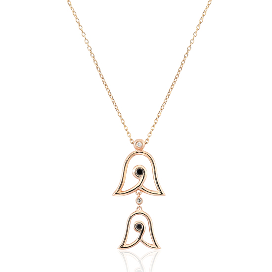 14 ayar kırmızı altın, yuvarlak kesim pırlanta ve yuvarlak kesim siyah pırlanta ile işlenmiş kolye.