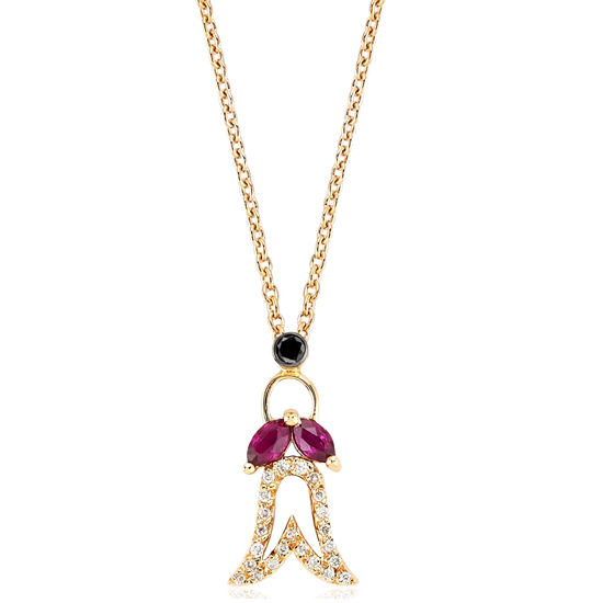 18 ayar kırmızı altın, yuvarlak kesim pırlanta, yuvarlak kesim siyah pırlanta ve mekik kesim yakut taşı ile işlenmiş kolye.