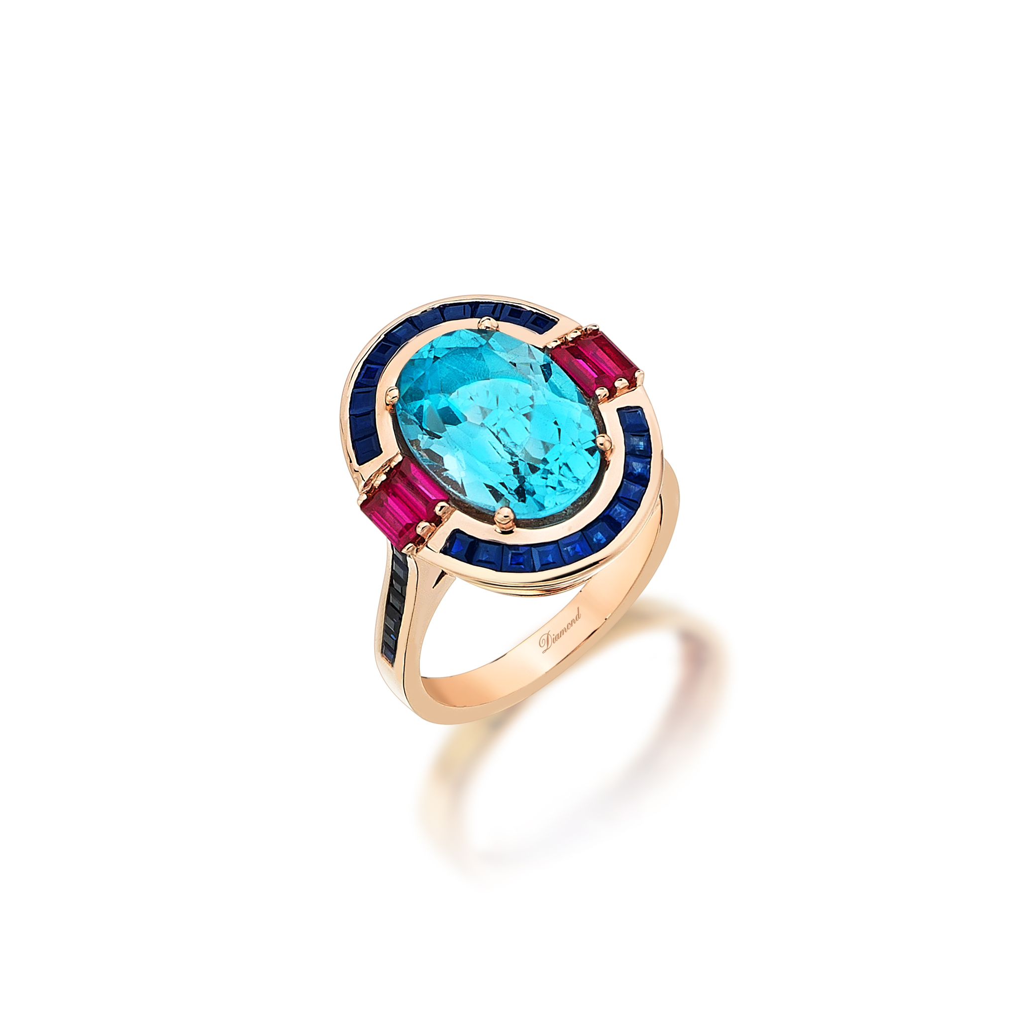 14 ayar rose altın, oval kesim mavi topaz, prenses kesim safir ve baget kesim yakut ile işlenmiş yüzük.