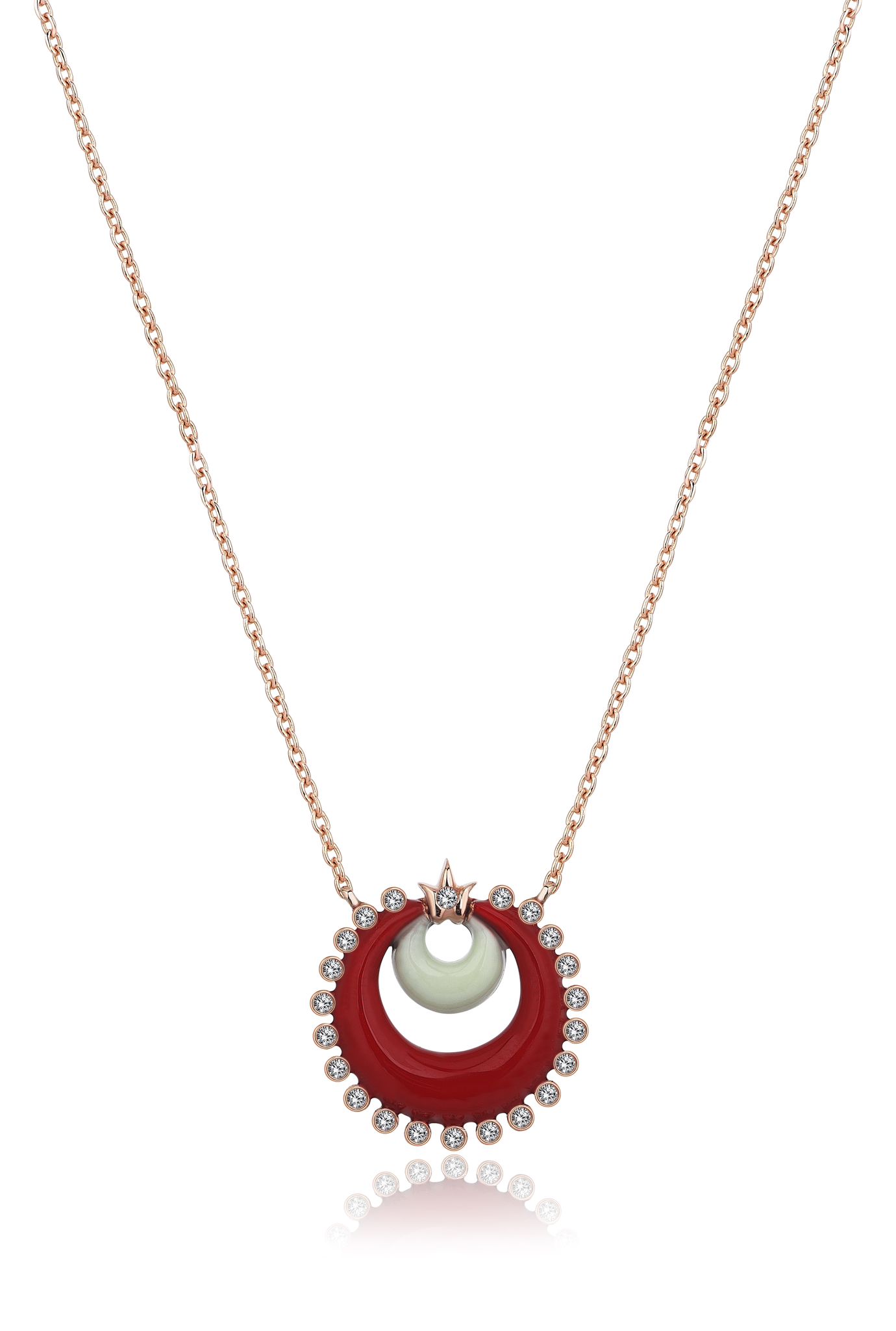 14 K rose altın, yuvarlak kesim pırlanta ve mine detaylı ay yıldız kolye.