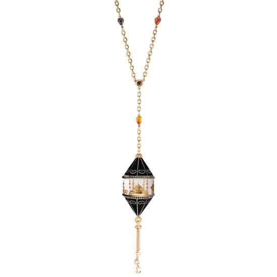 18 ayar kırmızı altın ve gümüş, yuvarlak kesim pırlanta, yuvarlak kesim siyah pırlanta ve yuvarlak kesim safir taşları ile işlenmiş mineli kolye.